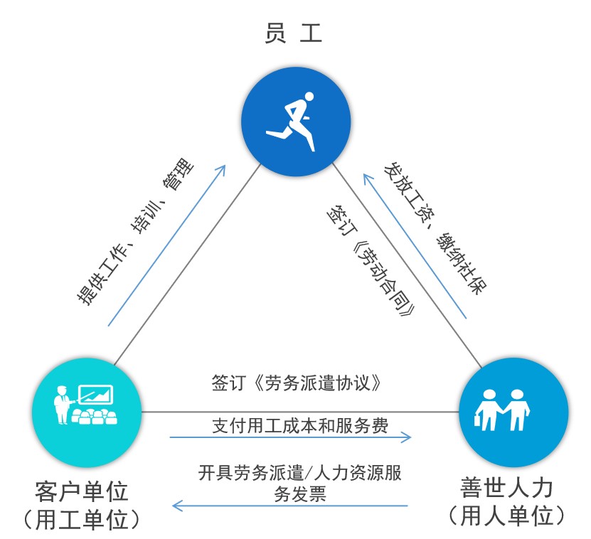 (2) 在劳务派遣三方关系中,派遣单位(人力资源公司)和员工之间建立劳动关系、签订劳动合同,员工社保关系落在派遣单位。