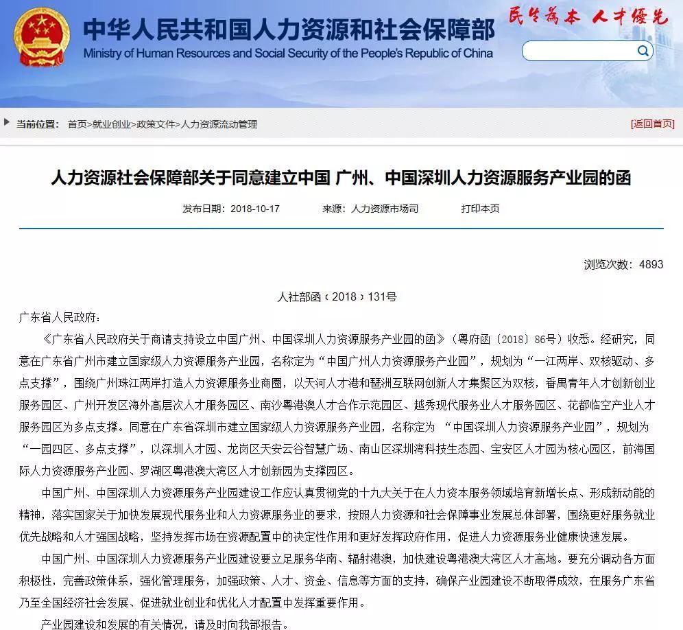 早在2018年国家人力资源社会保障部曾发布一则关于《人力资源社会保障部关于同意建立中国 广州、中国深圳人力资源服务产业园的函》,函的内容提及同意在广东省广州市建立国家级人力资源服务产业园,名称定为“中国广州人力资源服务产业园”,规划为“一江两岸、双核驱动、多点支撑”,围绕广州珠江两岸打造人力资源服务业商圈,以天河人才港和琶洲互联网创新人才集聚区为双核,番禺青年人才创新创业服务园区、广州开发区海外高层次人才服务园区、南沙粤港澳人才合作示范园区、越秀现代服务业人才服务园区、花都临空产业人才服务园区为多点支撑。