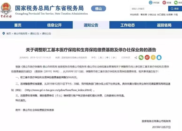 接国家税务总局广东省税务局通知,职工基本医疗保险和生育保险缴费基数调整为