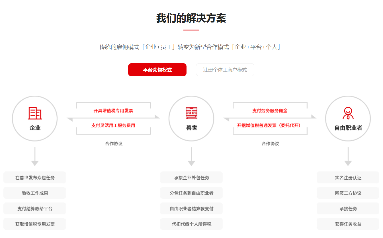 (3)企业通过善世灵活用工服务平台和个体工商户的合作,减少社保、降低个税风险。灵活用工降低社保入税影响,目前对于个人成立的个体工商户的方式解决个税和社保的问题,个税以地区核定征收,可享受10%或更低的税率优惠,社保则可按照灵活就业缴纳。