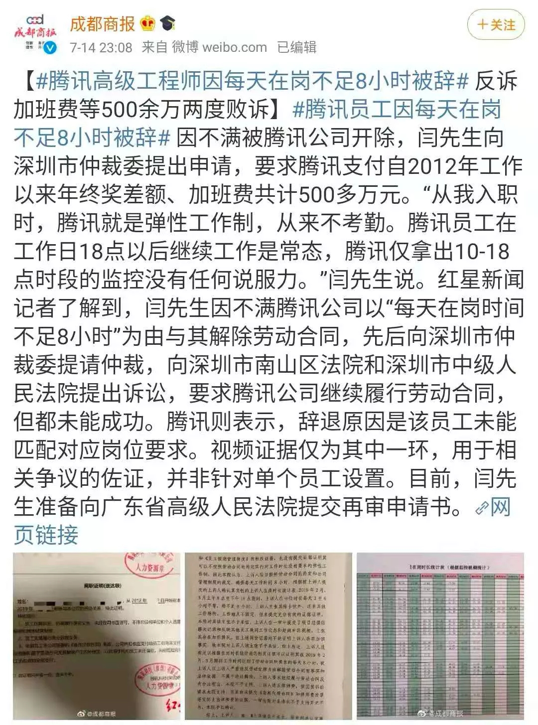 还记得一位腾讯前员工因“每天在岗不足8小时”被辞退吗?他反诉加班费等500余万,两度败诉,引发网友热议,在HR圈里中也掀起了不少的讨论。