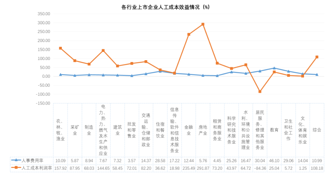 据善世获悉,不同行业的人工成本效益中,人工成本利润率最高的三个行业是房地产业(291.87%)、金融业(235.49%)、农、林、牧、渔业(157.92%),最低的三个行业是居民服务、修理和其他服务业(-84.36%)、文化、体育和娱乐业(1.25%)、卫生和社会工作(5.72%);人事费用率最高的三个行业是教育(46.10%)、居民服务、修理和其他服务业(30.04%)、卫生和社会工作(29.06%),最低的三个行业是批发和零售业(3.57%)、租赁和商务服务业(4.45%)、房地产业(5.76%)。
