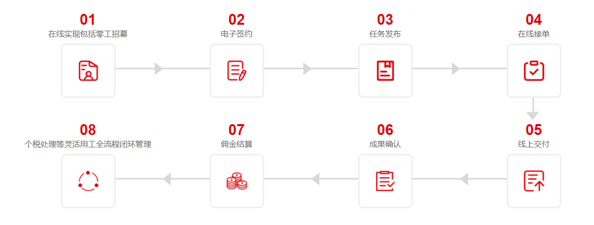 而灵猴Job开辟真零工赛道,如下图所示,提供从人员招募引流到任务发包、接包、合同签署、成果确认、费用结算、税务处理等全流程闭环的灵活用工服务。