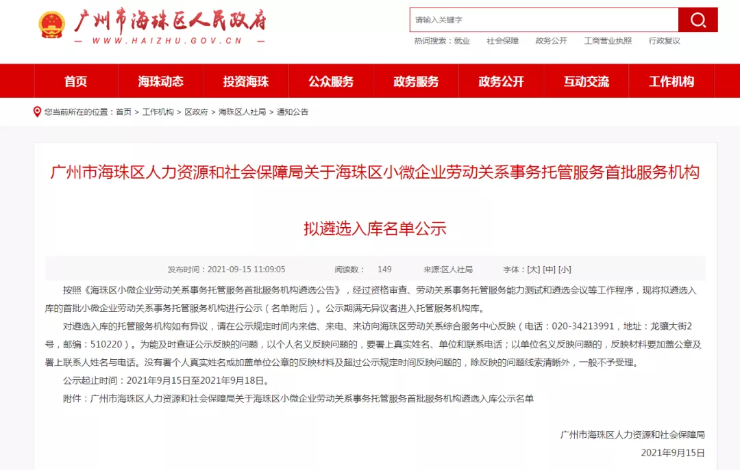 为此,广州市人社局在人力资源和社会保障工作改革创新“1+3”工作方案中选定海珠区作为试点,开展小微企业劳动关系事务托管服务工作,加大对小微企业的服务力度,充分发挥社会力量作用,规范小微企业用工管理。